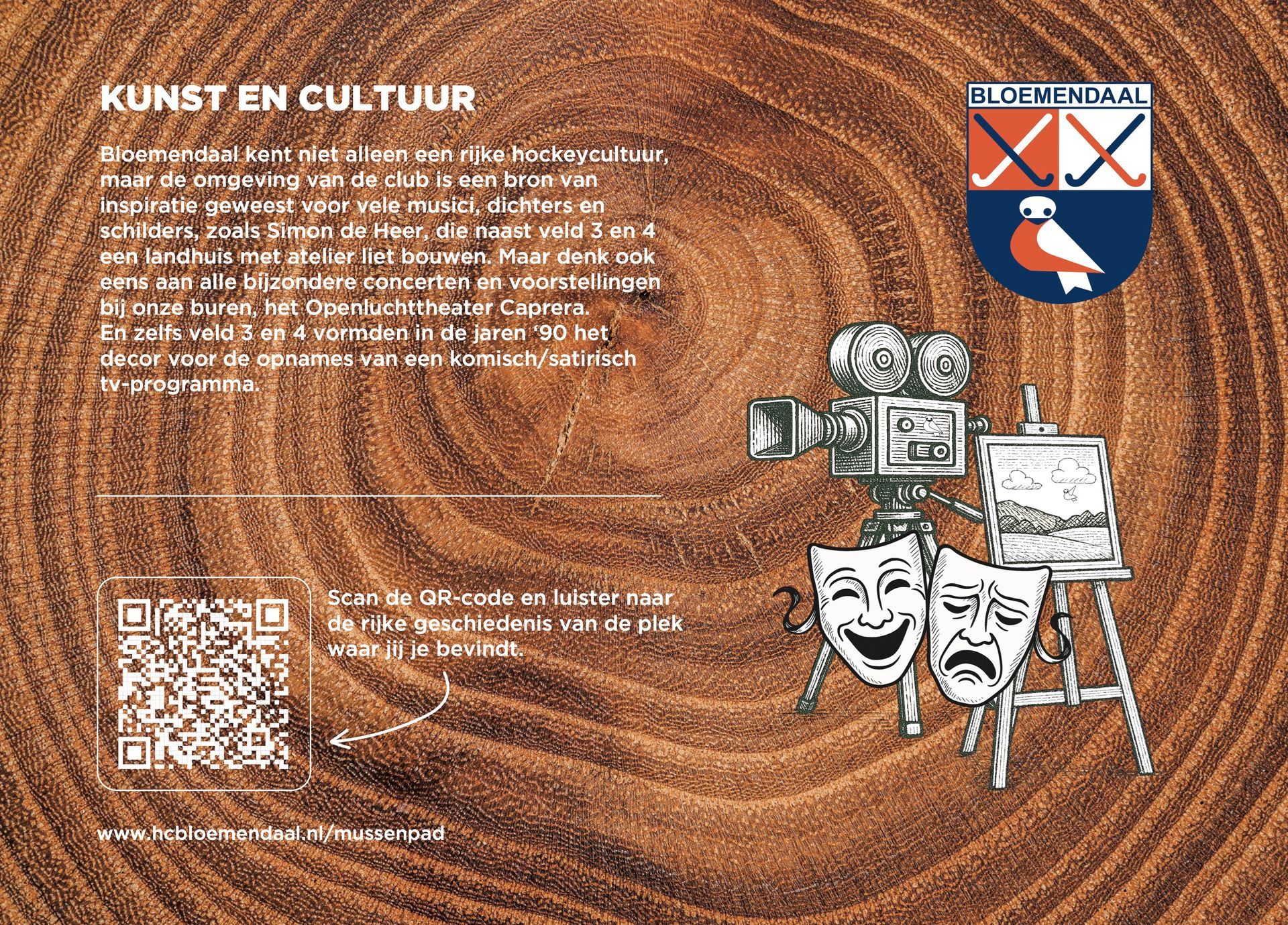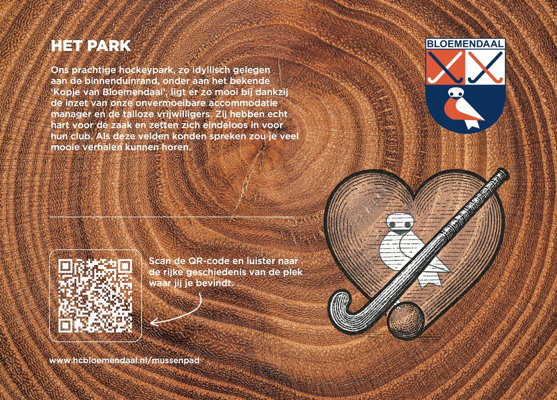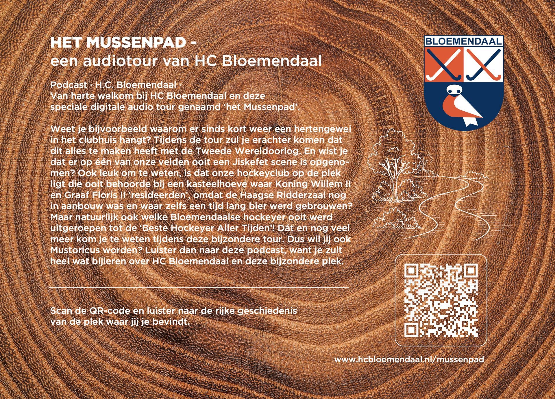 De bekende Nederlandse, maar natuurlijk ook Bloemendaalse, acteur én vrijwilliger op de club, Hidde Maas, alsmede prominente Bloemendaal hockeyers Cees-Jan Diepeveen, Floris-Jan Bovelander, Teun de Nooijer, Wouter Jolie, Jorrit Croon en Jaap Stockmann stonden garant voor het inspreken van de tour. Zij nemen de wandelaar / luisteraar mee in het heden en verleden van Hockeyclub Bloemendaal. Op het Mussenpad kom je van alles te weten over de omgeving, hoor je spannende verhalen over het Bloemendaals verzet in de Tweede Wereldoorlog en worden al onze helden en heldinnen geëerd, hockeyend en niet (meer) hockeyend.