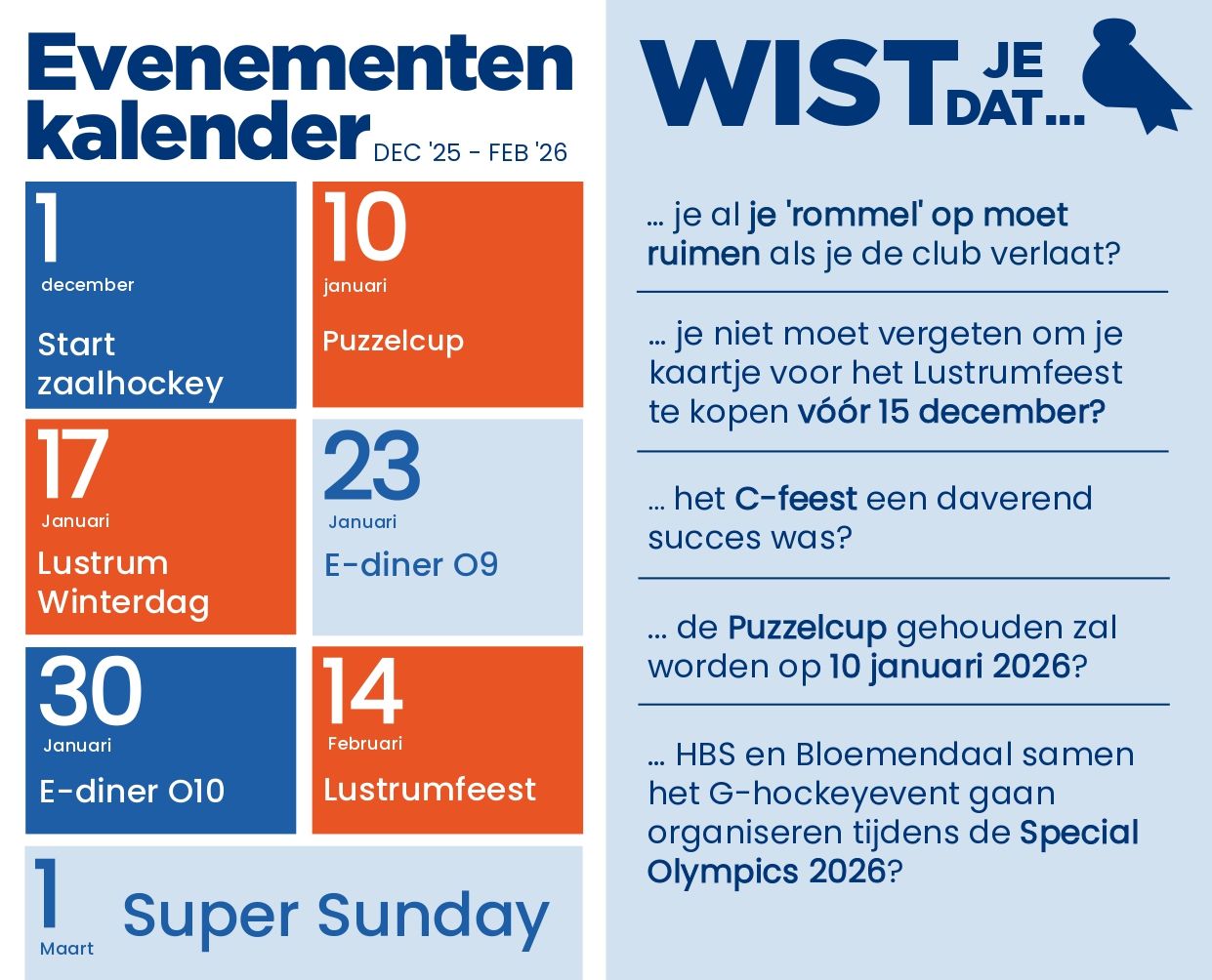 Tot slot nodigen wij jullie allemaal (oud en jong) graag alvast van harte uit voor de nieuwjaarsborrel op zaterdag 17 januari 2026. Zet deze dag alvast groot in je agenda, want dan vliegen alle (parad)ijsvogels van HC Bloemendaal weer uit voor een heerlijke Lustrum Winterdag! Een familiemiddag vol sport en spel, hapjes en drankjes, muziek en winterse gezelligheid. Speciaal voor deze dag toveren we de club om tot een waar winterparadijs. Iedereen is welkom! Verderop
