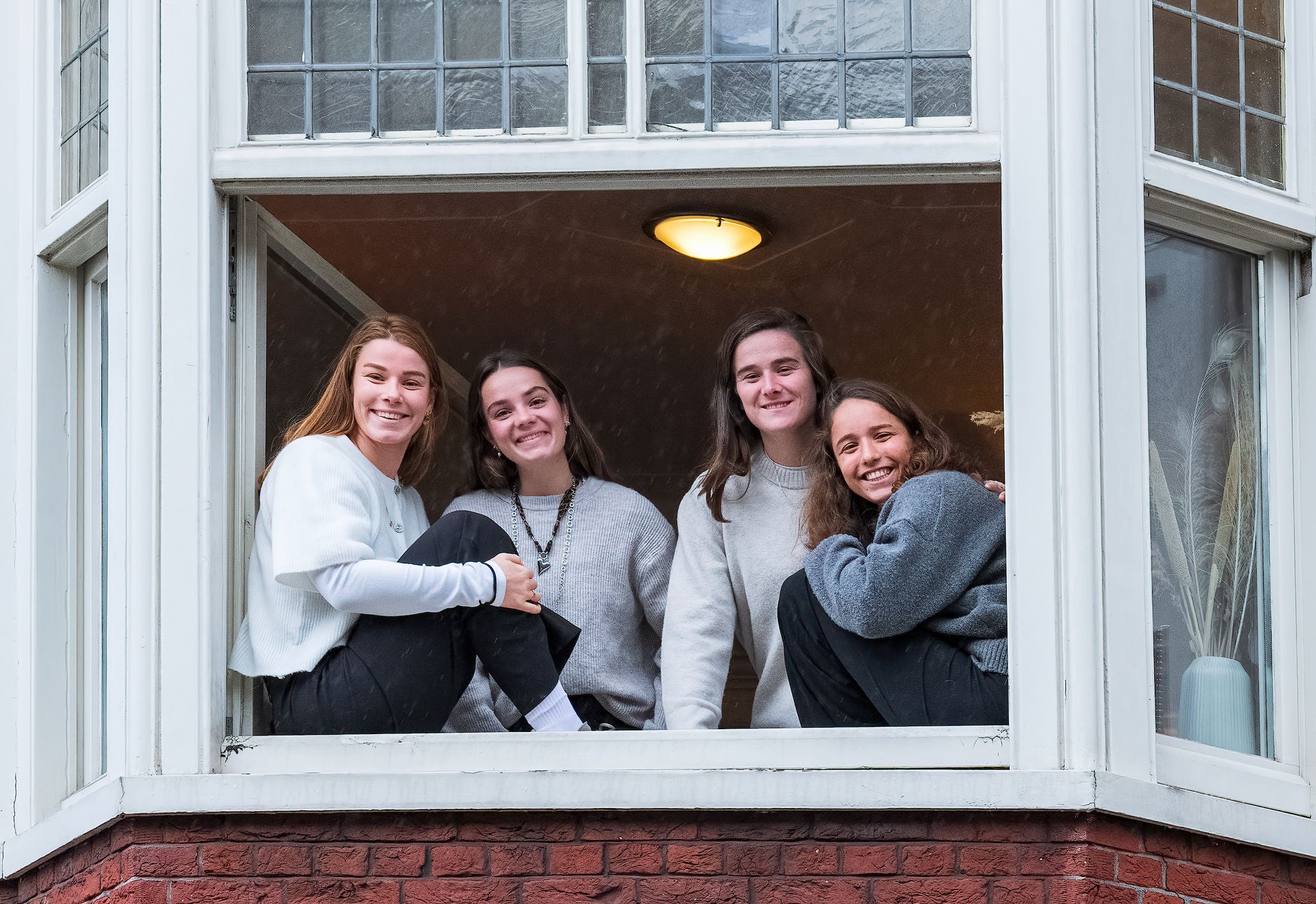 De meiden staan fris gedoucht klaar met koffie en kleine taartjes met een oranje touch. De woonkamer ademt gezelligheid: bloemen, kaarsjes en prullaria in de vensterbank. “Dat is Pien”, lachen ze. “Die zorgt altijd voor de huiselijke sfeer.” Op de muur prijkt groot het Bloemendaal-logo, geschilderd door oud-huisgenoot Malou Nanninga, die dit als afscheidscadeau achterliet. Isa nam haar plek in. Ze voelt zich inmiddels helemaal ingeburgerd, ondanks dat niemand haar Brabants dialect verstaat en woorden als