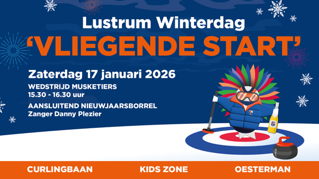 Vanaf 14.00 uur kun je buiten je geluk beproeven op de curlingbaan. Daag je teamgenoten, familie of vrienden uit voor een potje en warm daarna op bij de Koek & Zopie stand met glühwein, warme chocolademelk en oliebollen. Om 15.30 uur spelen de Musketiers (een team van oud-spelers van Heren 1) hun traditionele wedstrijd waarna we het feest naar binnen verplaatsen voor een knallende Nieuwjaarsborrel in après-ski-stijl. Voor de jongste (parad)ijsvogels is er een kidszone met knutselen, schminken, filmvoorstelling, broodje hotdog en andere lekkernijen.
