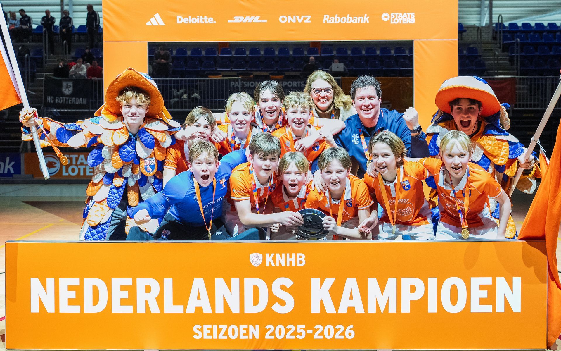 Tijdens de winterstop was er natuurlijk zaalhockey. En dat zaalseizoen werd afgesloten met een bijzondere mijlpaal: de jongens van JO14-1 zijn kampioen van Nederland geworden na een bloedstollende finale tegen Rotterdam. Voor een bomvol stadion (en ruim 4.000 kijkers via de livestream) maakten de mannen hun entree als ware sporthelden terwijl een oranje gekleurde tribune, juichende fans, vlaggendragers, de HC Bloemendaal Mus en een spectaculaire line-up voor een onvergetelijke sfeer zorgden. In de laatste vijf minuten werd de beslissende treffer gescoord: 5-3. Toen barstte het Oranjefeest los! Bloemendaal JO14-1 is landskampioen zaalhockey en schrijft daarmee geschiedenis.