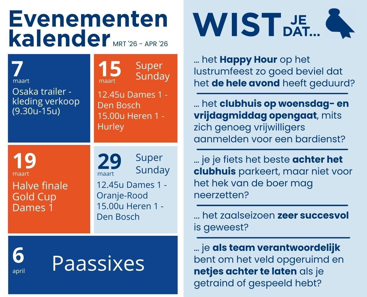 Op maandag 6 april (Tweede Paasdag) zijn de Paassixes, het allerleukste familie- en vriendentoernooi van het jaar. Het wordt ongetwijfeld een gezellige, sportieve dag vol hockey, spelletjes en plezier.