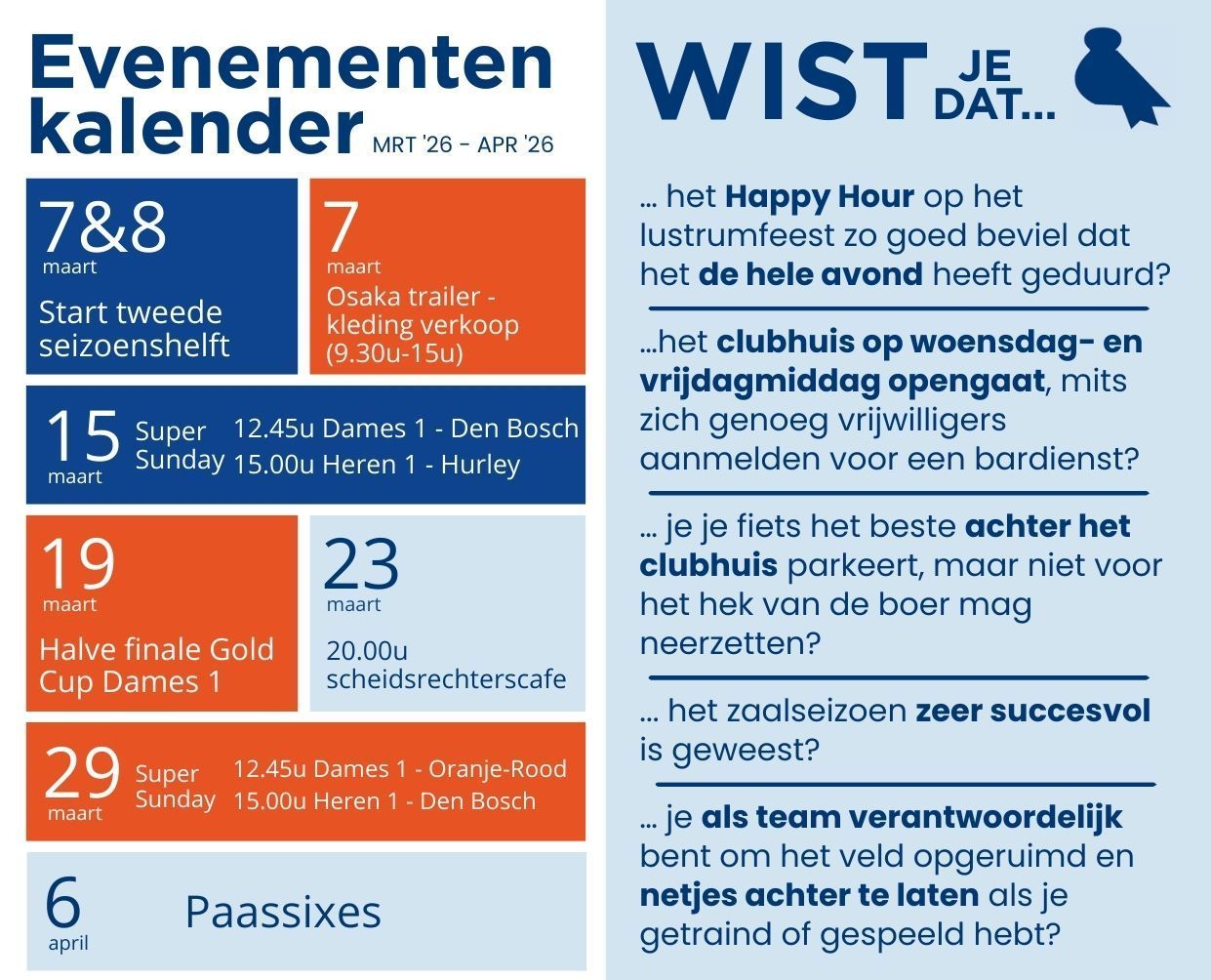 Tot slot nodigen wij jullie allemaal (oud en jong) graag alvast van harte uit voor de nieuwjaarsborrel op zaterdag 17 januari 2026. Zet deze dag alvast groot in je agenda, want dan vliegen alle (parad)ijsvogels van HC Bloemendaal weer uit voor een heerlijke Lustrum Winterdag! Een familiemiddag vol sport en spel, hapjes en drankjes, muziek en winterse gezelligheid. Speciaal voor deze dag toveren we de club om tot een waar winterparadijs. Iedereen is welkom! Verderop